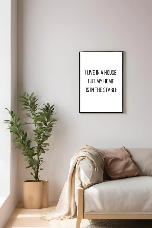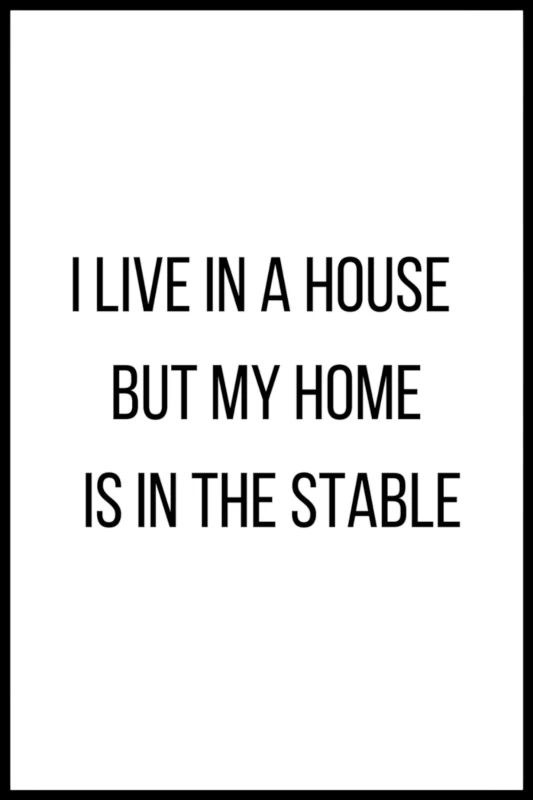 För många ryttare är stallet inte bara en plats för arbete, utan ett hem – där hjärtat finner ro och gemenskap med hästarna. Denna poster med citatet ”I live in a house but my home is in the stable” fångar den känslan av tillhörighet och kärlek till stallet.